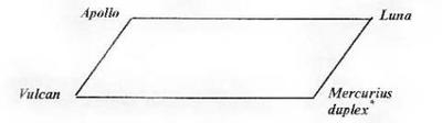 396 Исключительное положение одного из факторов в кватернионе также может выражаться в его двойственной природе. Например, четвертая из числа рек Рая, Евфрат, обозначает уста, сквозь которые входит пища и выходят молитвы, а также — Логос. В кватернионе Моисея, жена Моисея играет двойную роль — Зиппоры и "эфиопянки". Если мы построим кватернион из божественных эквивалентов четырех элементов Майера — Аполлона, Луны, Меркурия, Вулкана, — то получим брачный кватернион, в котором задействовано отношение "брат — сестра".