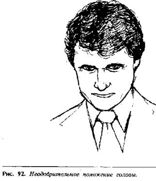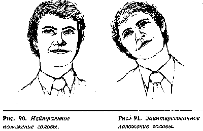 Существуют три основных положения головы. Первое — прямая голова (рис. 90). Это положение головы характерно для человека, нейтрально относящегося к тому, что он слышит. Голова обычно неподвижна, и время от времени делаются маленькие кивочки головой. При этом положении головы часто используются «рука-к-лицу» оценочные жесты.