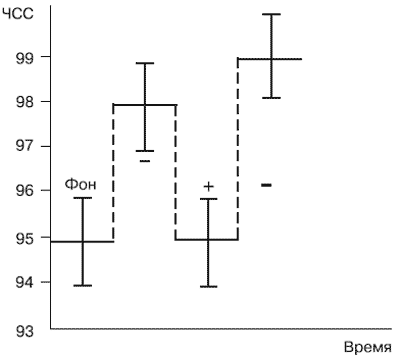 Рис. 9.2. Изменение частоты сокращений сердца (ЧСС) у испытуемого при чередовании эмоционально-отрицательных (–) и эмоционально-положительных (+) воспоминаний.