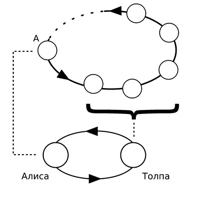 Вывод: цепочку осознанных представлений можно заменить на одно осознанное представление. И если эта цепочка когда-то замкнется, либидо вернется к Алисе (рис. 6.3), то мы снова воспользуемся правилом композиции. Всю толпу посредников и заместителей заменим одним представлением, которое так и назовем – Толпа. Все. Задача свелась к уже известному вам замещению (рис. 6.2).