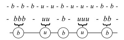 Рис. 6.5. Строчные латинские буквы обозначают представления из бессознательного (u) и сознания (b). Любую цепочку, содержащую представления из разных структур, можно свести к простой цепочке вида u-b-u. То есть ровно одно представление из бессознательного, ровно одно из сознания и т. д.