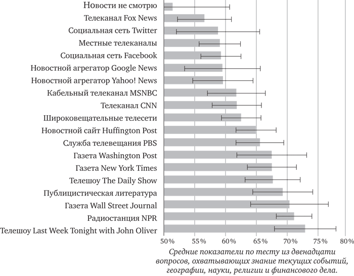 На диаграмме в виде отрезков изображены планки погрешности (разброс такой большой потому, что количество участников в разных исследованиях было разным). Зрители Fox News в среднем ответили верно на 75 % вопросов. Их результат лучше по сравнению с теми, кто новости не смотрит совсем, но они уступают всем прочим, кто выбрал из списка другие информационные источники.