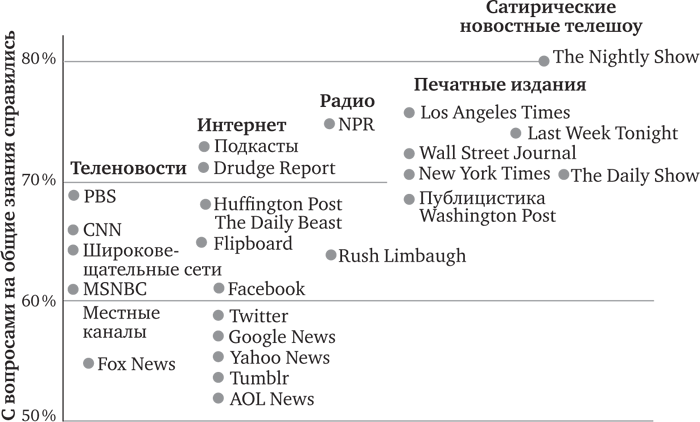 Газеты, не важно, печатного или электронного формата, в целом получили более высокие показатели, чем телевыпуски новостей (за исключением PBS). Как я уже отметил, мне не оставалось ничего другого, как поставить особняком The Daily Show и другие родственные передачи, ведь своими результатами они заметно превосходят серьезные новостные каналы и программы. Вопреки представлениям, будто The Daily Show – единственный источник новостей для своей аудитории, среди участников моего опроса среднестатистический зритель The Daily Show узнаёт о мире из 6–7 других информационных источников. Большинство поклонников The Daily Show сказали, что слушают NPR (59 %). Они также черпают новости из Facebook (50 %), PBS (38 %), CNN (34 %), MSNBC (31 %), New York Times (28 %) и публицистической литературы (28 %). Зрители The Daily Show, по сравнению с другими участниками опроса, реже отмечали в списке информационных источников новостные агрегаторы.