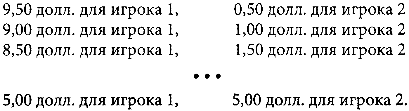 На все эти вопросы проливает свет ряд экспериментов, проведенных Канеманом, Нетчем и Талером[141]. Чтобы больше узнать, как люди реагируют на нечестные предложения, Канеман и его коллеги начали с того, что попросили участников разделить 10 долларов в очень похожей игре в ультимативный торг. Их замысел отличался от замысла Гута и его коллег, поскольку они просили игрока 1 ограничить выбор парами из следующего списка: