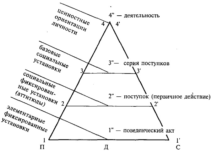 Если рассмотреть с позиций этой схемы иерархию уровней различных диспозиционных образований (Д), то логично обозначить соответствующую диспозицию на пересечении каждого уровня потребностей и ситуаций их удовлетворения. Тогда выделяются соответственно четыре уровня диспозиций: а) первый уровень составляют элементарные фиксированные установки, как их понимал Д.Н. Узнадзе: они формируются на основе витальных потребностей и в простейших ситуациях в условиях семейного окружения, и в самых низших «предметных ситуациях» (чему в западных исследованиях и соответствует термин «set»); б) второй уровень — более сложные диспозиции, которые формируются на основе потребности человека в общении, осуществляемом в малой группе, соответственно, — социальные фиксированные установки или аттитюды, которые по сравнению с элементарной фиксированной установкой имеют сложную трехкомпонентную структуру (когнитивный, аффективный и поведенческий компоненты); в) третий уровень фиксирует общую направленность интересов личности относительно конкретной сферы социальной активности, или базовые социальные установки (формируются в тех сферах деятельности, где личность удовлетворяет свою потребность в активности, проявляемой как конкретная «работа», конкретная область досуга и пр.). Так же, как и аттитюды, базовые социальные установки имеют трехкомпонентную структуру, но это не столько выражение отношения к отдельному социальному объекту, сколько к каким-то более значимым социальным областям; г) четвертый, высший уровень диспозиций образует система ценностных ориентации личности, которые регулируют поведение и деятельность личности в наиболее значимых ситуациях ее социальной активности, в которых выражается отношение личности к целям жизнедеятельности, к средствам удовлетворения этих целей, т.е. к обстоятельствам жизни личности, детерминированным общими социальными условиями, типом общества, системой его экономических, политических, идеологических принципов.