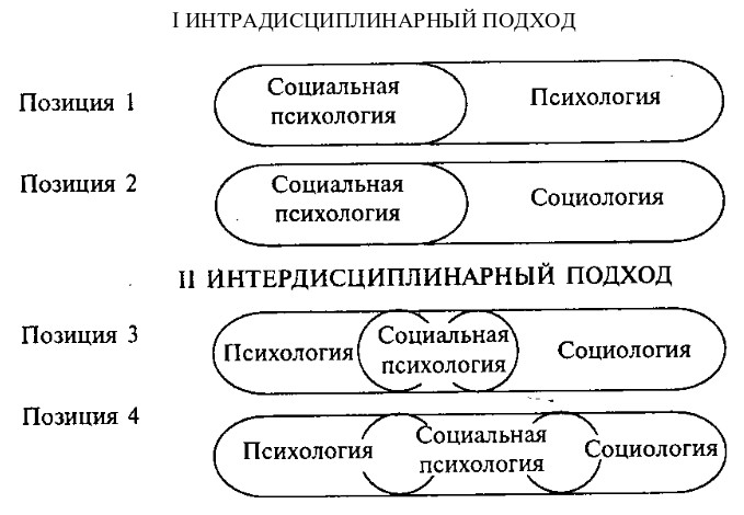 Несмотря на кажущиеся довольно существенные различия, все предложенные подходы по существу останавливаются перед одной и той же проблемой: какая же «граница» отделяет социальную психологию от психологии, с одной стороны, и от социологии — с другой. Ведь где ни «помещать» социальную психологию, она все равно при всех условиях граничит с этими двумя дисциплинами. Если она часть психологии, то где граница именно социально-психологических исследований внутри психологии? Социология, если она даже при таком рассмотрении оказалась за пределами социальной психологии, все равно тоже граничит с ней в силу специфики предмета той и другой дисциплины. Такое же рассуждение можно привести и относительно положения социальной психологии внутри социологии. Но и при интердисциплинарном подходе мы не уйдем от вопроса о «границах»: что значит «на стыке», какой частью стыкуются психология и социология? Или что значит «самостоятельная дисциплина»: «отсекает» ли она какие-то части у психологии и социологии или вообще имеет какие-то абсолютно самостоятельные области, не захватываемые никоим образом ни психологией, ни социологией.