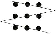 Решить задачу тремя линиями может показаться невозможным, если предполагать, что линии должны проходить через центр каждой точки. Если мы отойдём от этих предположений, мы можем решить задачу таким способом: