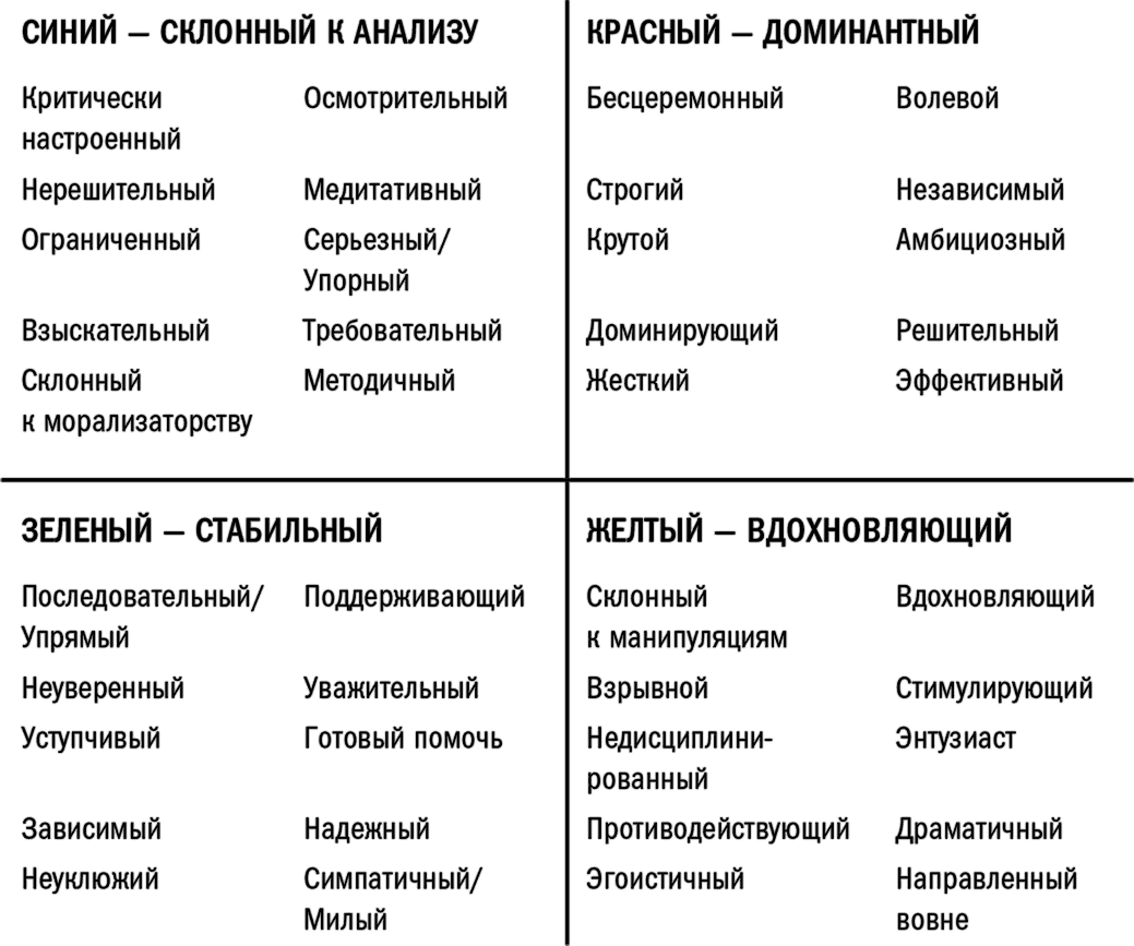 Лучший совет, который я могу вам дать: если вы не можете определить, какого цвета ваш коллега или собеседник, – перестаньте говорить и начинайте слушать. Иными словами, если вы не уверены – ведите себя как зеленый. Иногда я слышу комментарии типа: этого человека невозможно расшифровать, он же ничего не делает. Но даже абсолютно пассивная личность в любом случае демонстрирует какое-то поведение. И теперь вы знаете, какого цвета скорее всего окажется человек, о котором говорят, что он еле двигается. Медлительность – типичная черта синего типа поведения.