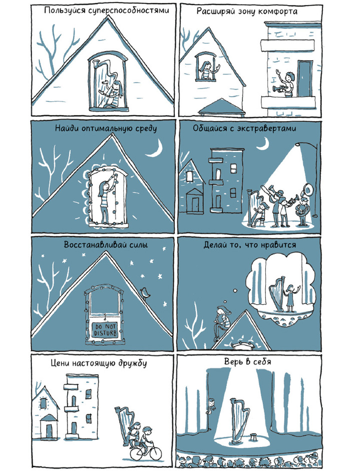 СЛЕДУЙ СВОИМ ИНТЕРЕСАМ. Благое дело, мечта, увлечение будут мотивировать тебя на новые свершения и выход из зоны комфорта. Это могут быть спорт, искусство, любовь к конструированию и механизмам. Несколько лет назад я поняла, что мое дело — писательство, а цель — распространение информации об интроверсии и продвижение проекта «Тихая революция». Я объехала весь мир, выступая перед огромными залами не потому, что люблю привлекать к себе внимание. Я выхожу на сцену и выступаю перед людьми, потому что верю в свою миссию: я должна рассказать людям о силе интровертов. Найди свою страсть, оставайся верным себе, используй свои сильные стороны — и ты непременно добьешься цели.