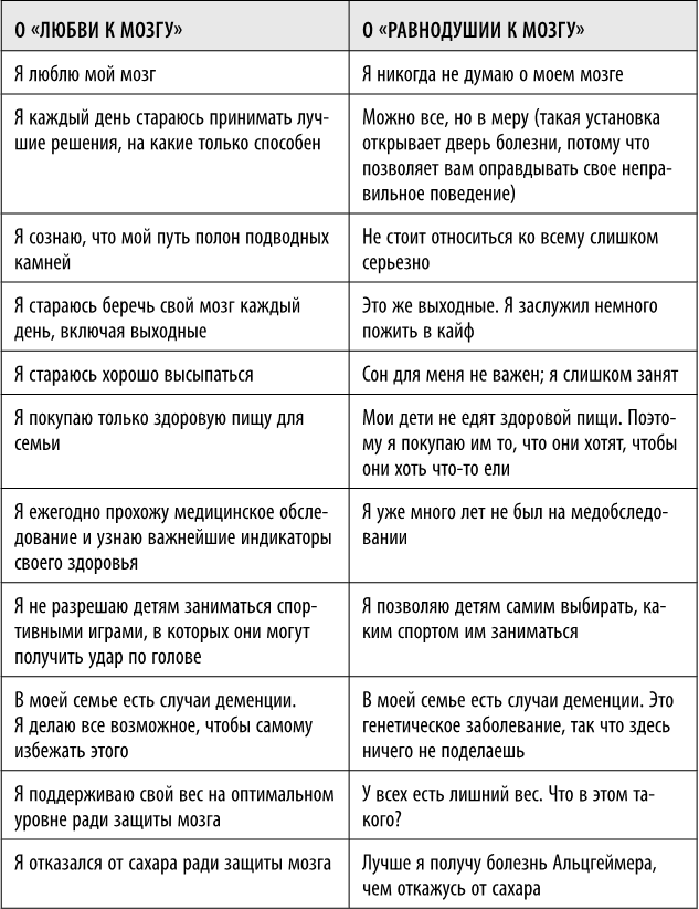 Для большей ясности давайте сравним десять утверждений моих пациентов насчет «любви к мозгу» и «равнодушии к мозгу».