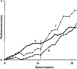Рис. 17. Показатели роста воспитанников двух немецких приютов. В первые 26 недель исследования показатели роста в приюте А, под руководством фрейлейн Грун, были намного выше, чем те же в приюте Б, где правила суровая фрейлейн Шварц. На 2б-й неделе (вертикальная линия) фрейлейн Грун покинула приют А, и ей на смену пришла фрейлейн Шварц. Показатели роста в этом приюте быстро ухудшились; а в приюте Б, где теперь не было пресловутой фрейлейн Шварц, улучшились и скоро превысили показатели приюта А. Очень интересно также отметить, что фрейлейн Шварц не была такой уж бессердечной и у нее было несколько любимчиков (кривая С), которых она забрала с собой