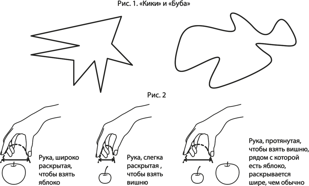 Когда во сне я отлеживаю себе руку и меняю положение тела, даже не проснувшись, я в этот момент думаю этим самым «протомышлением». Когда мой мозг отождествляет одну фигуру Вилейанура Рамачандрана с «бубой», а другую — с «кикой» (рис. 1), это тоже мыслительный процесс, который, впрочем, я даже не могу толком осознать. Это «протомышление». Наконец, когда моя рука сама определяет, как растопырить пальцы, направляя руку в тарелку с фруктами (рис. 2), — она делает это не сама по себе, но и не бессмысленно, хотя, конечно, мое личностное «я» тоже не вычисляет этот угол. Все это примеры «протомышления».