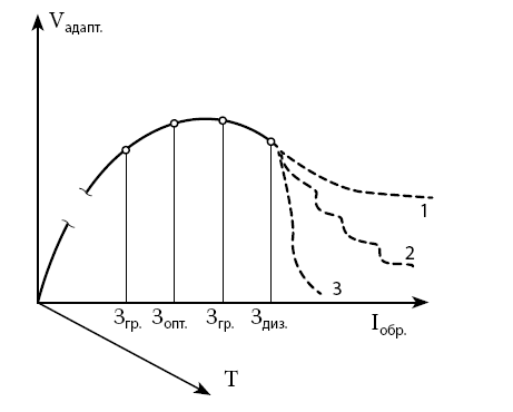 Здиз. – зона дизадаптивного состояния. Пунктирные линии показывают возможный (условный) спектр характера протекания дизадаптивного состояния при дальнейшем увеличении образовательных воздействий.