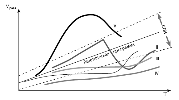 Рис. 1.2. Графическое представление условно-нормативного развития в «границах» социально-психологического норматива Приведены аттракторы различных вариантов отклоняющегося психического развития (см. главу 7): I. Задержанное развитие; II. Поврежденное развитие (с благоприятным прогнозом); III. Парциальное недоразвитие (обобщенное представление); IV. Тотальное недоразвитие; V. Вариант искаженного развития (преимущественно когнитивной сферы). Vразв. – объем развития, Т – время