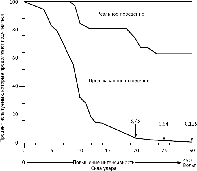 На рис. 5 мы сравнили предсказания 40 психиатров из одной крупной медицинской школы с реальным поведением испытуемых в ходе эксперимента. Психиатры предсказали, что большинство испытуемых не выйдет за предел 10-го уровня удара (150 В – на этом уровне жертва в первый раз выражает недвусмысленное требование, чтобы ее отпустили). Далее, они предсказали, что 12-й уровень удара (300 В – на этом уровне жертва отказывается отвечать) продолжат подчиняться 3,73% испытуемых, а самый сильный удар на шкале нанесет лишь немногим больше 0,1%. Однако, как видно из графика, реальное поведение существенно отличается от прогнозов. 62% испытуемых полностью подчинились приказам экспериментатора. Между ожиданиями и реальностью зияет колоссальная брешь.