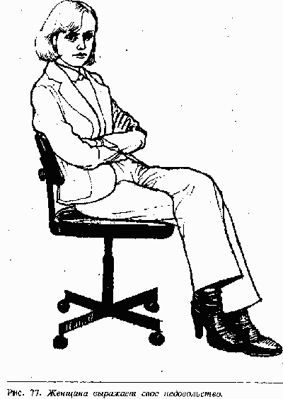 Часто люди используют этот жест в холодную погоду. Когда закинутая нога на ногу сопровождается еще и скрещиванием рук на груди (рис. 77), это означает, что человек «отключился» от разговора. Коммивояжеру глупо было бы даже пытаться спрашивать покупателя, принявшего такую позу, о его решении, и следует задать несколько уточняющих вопросов, чтобы выяснить его возражения. Эта поза очень популярна у женщин во всем мире, особенно если они хотят выразить свое недовольство мужем или другом.