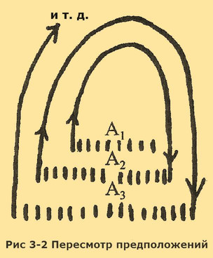 Мы начинаем с набора предположений, обозначенных «А1». Следуют определённые заключения, которые проверяются и пересматриваются по необходимости, чтобы мы могли сформировать более широкий набор более адекватных предположений, обозначенных «А2». Эти предположения, в свою очередь, могут быть пересмотрены, чтобы сформировать новый набор, обозначенный «А3». И так процесс продолжается.